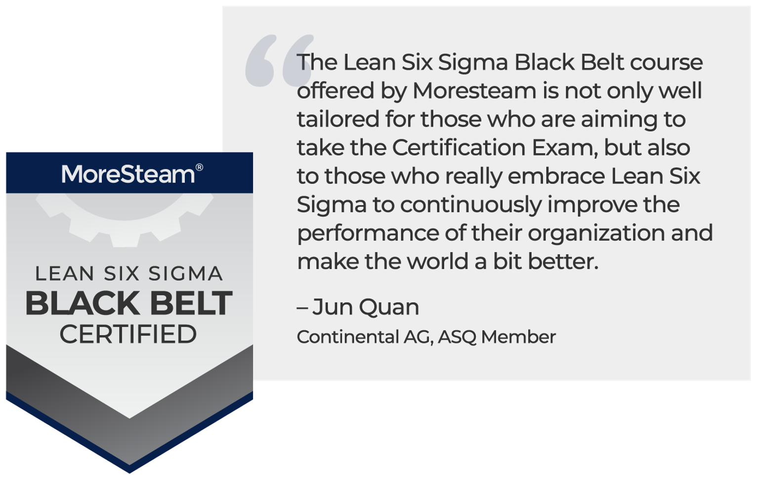 MoreSteam's Black Belt course equips a Six Sigma Black Belt with advanced Lean Six Sigma problem-solving skills, project leadership expertise, and hands-on experience using Lean Six Sigma tools and methodologies. The course content was reviewed and approved by ASQ for alignment with their Black Belt body of knowledge. View a detailed outline of the course content. For the skills and competencies covered, see the Black Belt Body of Knowledge .