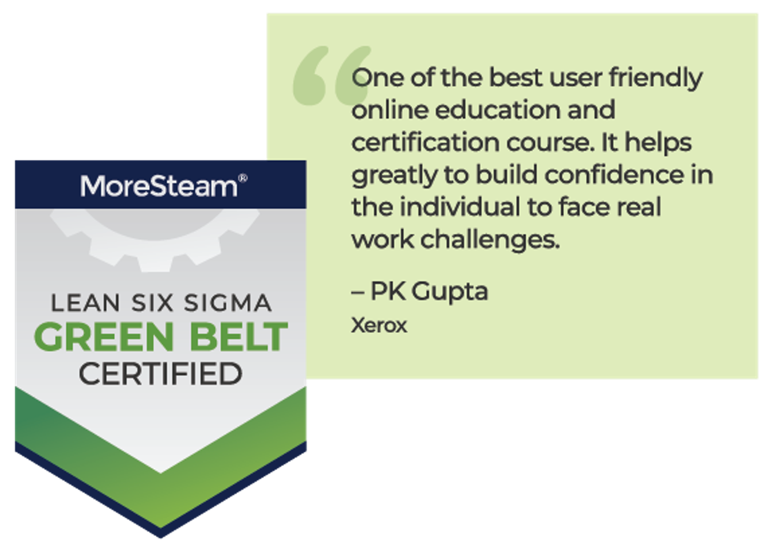 MoreSteam is the premier provider of online training, certification, and technology for Lean Six Sigma. With over 20 years of experience, our eLearning courses and blended learning programs have been used and refined by companies and universities worldwide. As a MoreSteam Green Belt, you will become part of a network of over 800,000 graduates, including people from more than half of all Fortune 500 companies and numerous prestigious universities.