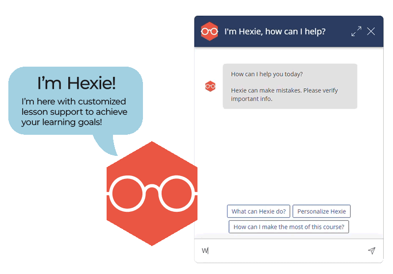 Introducing Hexie, your Personalized AI Tutor, designed to guide you through your eLearning experience. Hexie provides real-time coaching, tailored feedback, and insights to help you better understand course material and achieve your learning goals.