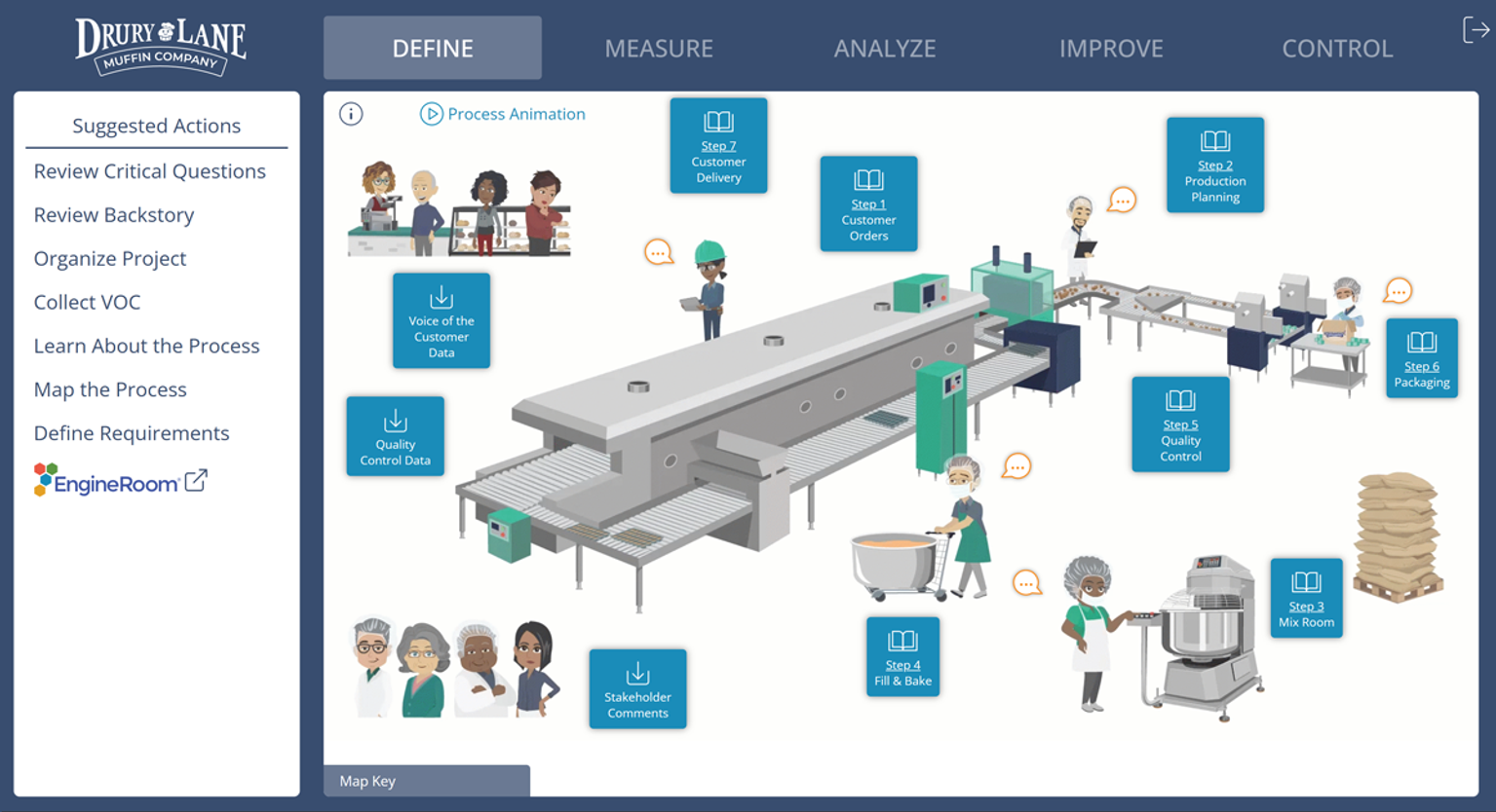 Drury Lane is an interactive lean six sigma training simulation that guides participants through the complete DMAIC process in a high-volume manufacturing environment. Set inside a commercial bakery facing quality and consistency issues, the simulation challenges learners to investigate real production data, observe process flow, and uncover the root causes of variation. By working through realistic constraints like fixed batch sizes, mandated maintenance schedules, and flow issues, participants gain practical experience applying structured problem-solving to drive measurable improvement.