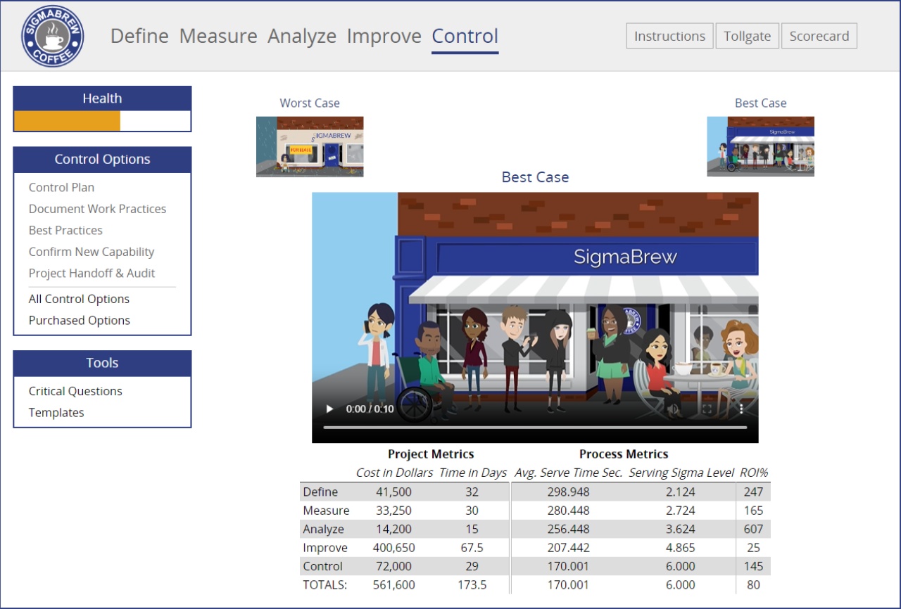 The simulation is based on SigmaBrew, a thorough case study of a large coffee retailer struggling with quality and customer service issues. In SigmaBrew, students are drawn into a compelling story of economic pressures and inefficient processes. Online movies, survey results, process maps and scorecards all work to shape a world that engages their interest and propels their desire to successfully complete the project.