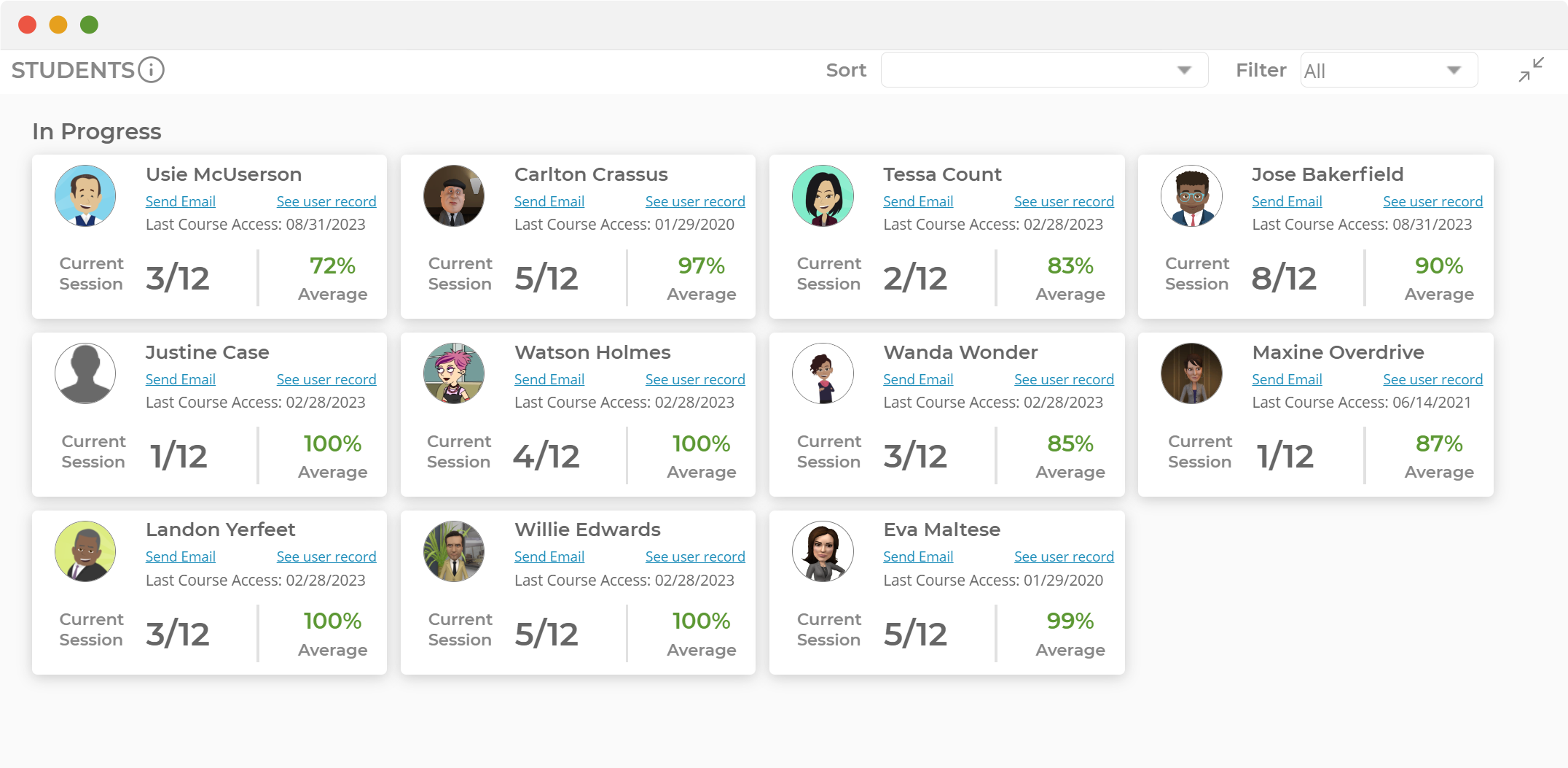 Quickly monitor progress across your cohort and drill down into students who need intervention.