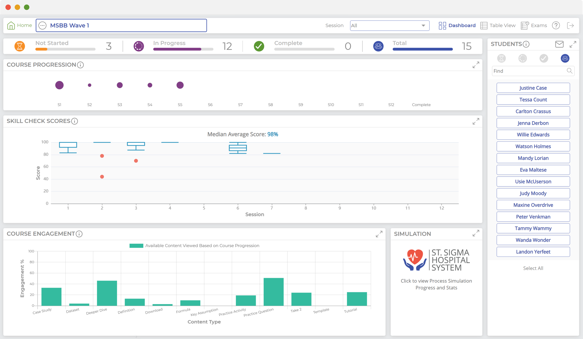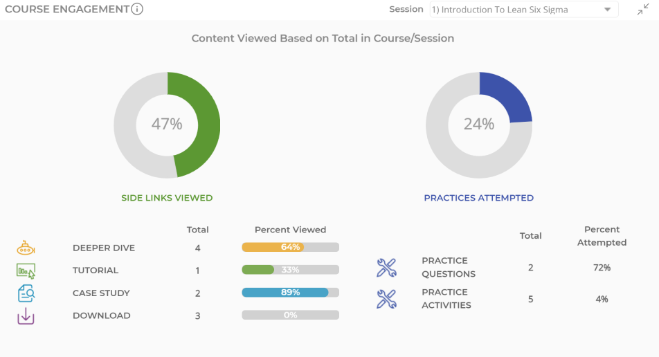 Coach View is your command center for Lean Six Sigma coaching. This intuitive dashboard gives you a snapshot of your training cohort, visualizing key metrics like skill check scores (via box plots), learner progress (via bubble plots), and engagement levels with critical course components such as videos and practice exercises.